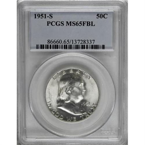 <B>1951-S 50C MS65 Full Bell Lines PCGS.</B></I> PCGS Population (343/78). NGC Census: (33/10). Numismedia Wsl. Price for NGC/PCGS coin in MS65: $480. (#86660)<BR><BR><b>Shipping:</b> Coins & Currency (<a target="_blank" href="http://www.heritageauctions.com/common/shipping.php">view shipping information</a>)