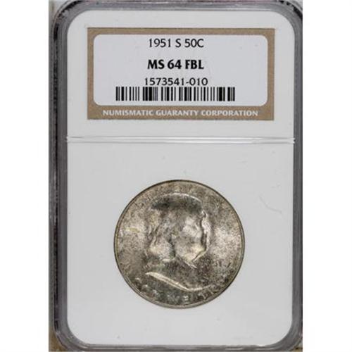 <B>1951-S 50C MS64 Full Bell Lines NGC.</B></I> NGC Census: (26/41). PCGS Population (488/407). Numismedia Wsl. Price for NGC/PCGS coin in MS64: $132. (#86660)<BR><BR><b>Shipping:</b> Coins & Currency (<a target="_blank" href="http://www.heritageauctions.com/common/shipping.php">view shipping information</a>)