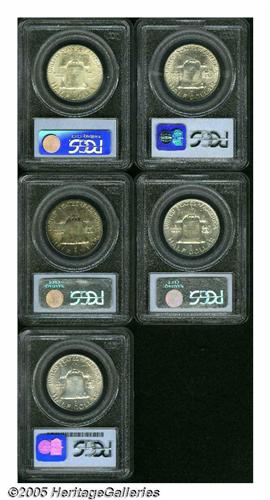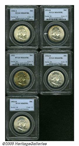 <B>1951-S<50C> MS65 Full Bell Lines PCGS,</B></I> slightly matte, attractive Gem; <B>1952 MS66 Full Bell Lines PCGS,</B></I> attractive mint-green and crimson color, nice luster and a good strike; <B>1952-D MS65 Full Bell Lines PCGS,</B></I> slightly icy, lustrous and well defined; <B>1953-D MS65 Full Bell Lines PCGS,</B></I> lustrous with golden rims and virtually unimpaired surfaces; and a<B>1954-D MS66 Full Bell Lines PCGS,</B></I> Superb-Gem example with frosty surfaces and just some faint contacts, including one on the bell lines.<BR><I>From The Southern Collection.</B></I>