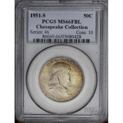 <B>1951-S<50C> MS66 Full Bell Lines PCGS.</B></I> Ex: Chesapeake Collection. Mint Set toning overlays the obverse in well blended olive-orange, russet, and lilac-gray shades. A few swirls of lighter sandy-tan color are also intermingled on that side. The reverse is equally as original, although the appearance is one of freckled copper-russet shadings over a base of silver-gray color. Fully frosted with nary a distracting blemish to report, this coin is among the finest '51-S halves known to NGC and PCGS. Combined population for these two grading services: 80 in 66, 1 finer (3/06).<BR><I>From The Alex & Nan Registry Sets.</B></I> <BR><BR><B>Important notice:</B> Heritage usually auctions material at the rate of 200-250 lots per hour. On some occasions eBay Live bid software or the Internet may not be able to keep up with the pace of the auction. We recommend placing a realistic absentee bid now as insurance to avoid disappointment. Occasionally the auctioneer may eliminate or reject an eBay Live bid, and the auctioneer may also reopen a lot after the close of the eBay live bidding (usually because we missed an audience bid), and may reject your bid even if it shows you as the winning bidder. By bidding via eBay Live, you agree that Heritage may award the lot to another bidder at its sole discretion under the circumstances described above or any other reasonable circumstances. Since eBay bids are not shown to us until we open the lot on the floor, we treat those bids just like floor bids. In most cases the floor responds before the eBay bid is presented to us, due to Internet lag time, so for consistency we have made it a policy that floor bids are always considered first over tie eBay live bids. Also please note that all Heritage lots purchased through eBay Live carry a 20% Buyer's Premium. Please make sure you read the Terms and Conditions before you bid. This lot is being auctioned in conjunction with a live floor auction by Heritage Galleries & Auctioneers. All final auction and invoice information will be supplied by Heritage Galleries & Auctioneers, and all other information should be considered preliminary. Lot:3095 <BR><BR><B>Winning Notification and Billing:</B> After the FINAL session in this auction is complete, Heritage will send e-mail and snail mail invoices. This process normally takes several days. All final auction and invoice information will be supplied by Heritage Galleries & Auctioneers, and all other information should be considered preliminary. <BR><BR>This auction will be conducted on a live auction floor and over the Internet through eBay Live. If you choose to place an absentee bid, please take a moment to <font color='#0000ff'><u><a href='http://pages.ebay.com/liveauctions/help/before/laabsentee.html'>learn how eBay Live absentee bidding works</a></u></font><font color='#000000'>
