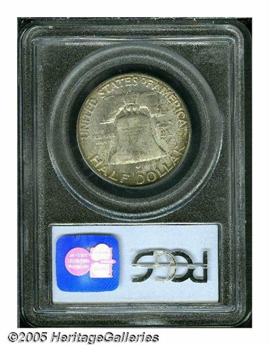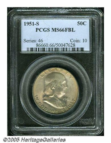 <B>1951-S<50C> MS66 Full Bell Lines PCGS.</B></I> Lustrous surfaces are enveloped with gold-beige patina with ice-blue undertones on the obverse, and dappled olive-green toning on the reverse. The design elements are sharply struck, and both faces appear to be devoid of significant marks. Population: 68 in 66, 0 finer (5/05).