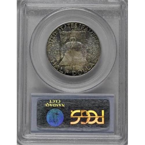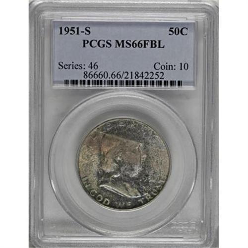<B>1951-S 50C MS66 Full Bell Lines PCGS.</B></I> Mottled purple and aqua toning is joined by a swath of golden-orange on the obverse. Lustrous surfaces are seemingly devoid of any significant marks. Population: 81 in 66 Full Bell Lines, 0 finer (9/07).<BR><BR><b>Shipping:</b> Coins & Currency (<a target="_blank" href="http://www.heritageauctions.com/common/shipping.php">view shipping information</a>)