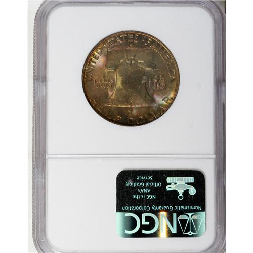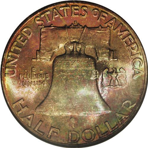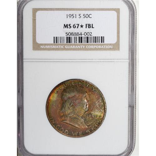 <B>1951-S 50C MS67 <img border='0' src='http://www.heritagecoins.com/images/star.gif' width=10 height=10> Full Bell Lines PCGS.</B></I> Regardless of one's preference for toned or brilliant Full Bell Lines halves, it is difficult to deny the appeal of this Superb Gem. The devices are solidly struck, and the softly lustrous surfaces have sublime magenta, orange, lime-green, and violet patina. NGC has graded just one Full Bell Lines example of this issue in MS67, and the Star designation is simply icing. A connoisseur's coin.<BR><BR><b>Shipping:</b> Coin/Currency (<a target="_blank" href="http://www.heritageauctions.com/common/shipping.php">view shipping information</a>)