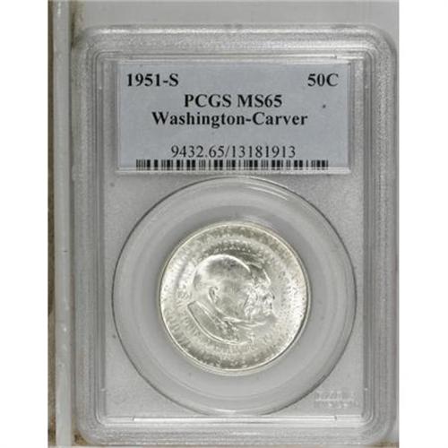 <B>1951-S 50C Washington-Carver MS65 PCGS.</B></I> PCGS Population (627/87). NGC Census: (348/147). Mintage: 10,000. Numismedia Wsl. Price for NGC/PCGS coin in MS65: $108. (#9432)<BR><BR><b>Shipping:</b> Coins & Currency (<a target="_blank" href="http://www.heritageauctions.com/common/shipping.php">view shipping information</a>)