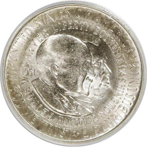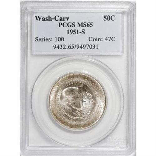 <B>1951-S 50C Washington-Carver MS65 PCGS.</B></I> PCGS Population (627/87). NGC Census: (350/147). Mintage: 10,000. Numismedia Wsl. Price for NGC/PCGS coin in MS65: $108. (#9432)<BR><I>From The Frank DuVall Collection of U.S. Commemoratives.</B></I><BR><BR><b>Shipping:</b> Coins & Currency (<a target="_blank" href="http://www.heritageauctions.com/common/shipping.php">view shipping information</a>)