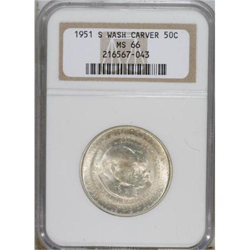 <B>1951-S 50C Washington-Carver MS66 NGC.</B></I> NGC Census: (138/9). PCGS Population (87/0). Mintage: 10,000. Numismedia Wsl. Price for NGC/PCGS coin in MS66: $484. (#9432)<BR><BR><b>Shipping:</b> Coins & Currency (<a target="_blank" href="http://www.heritageauctions.com/common/shipping.php">view shipping information</a>)