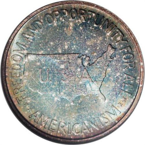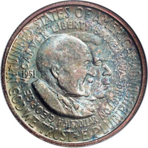 <B>1951-S 50C Washington-Carver MS67 NGC.</B></I> Flashy and semi-prooflike, with deep layers of turquoise, lavender, and gold toning. This Superb Gem example displays essentially full striking detail on each side, and the combination of intense mint luster and vivid, original patina is bewitching. Few Washington-Carvers can match this one in terms of sheer eye appeal. Census: 10 in 67, 0 finer (10/07). <BR><BR><b>Shipping:</b> Coins & Currency (<a target="_blank" href="http://www.heritageauctions.com/common/shipping.php">view shipping information</a>)