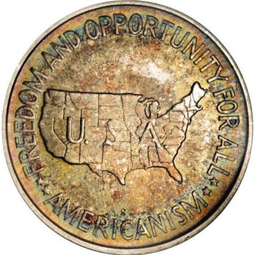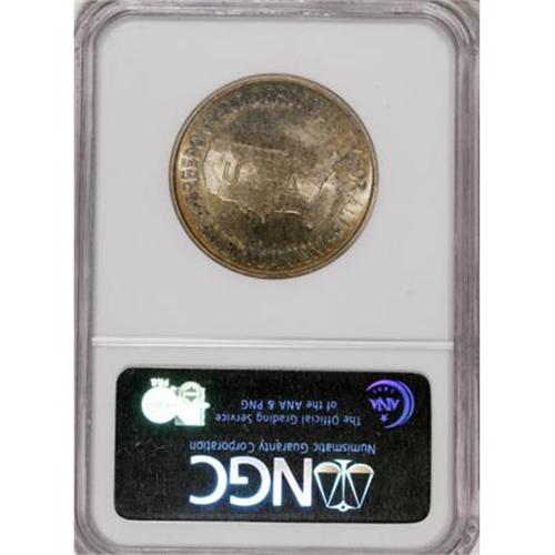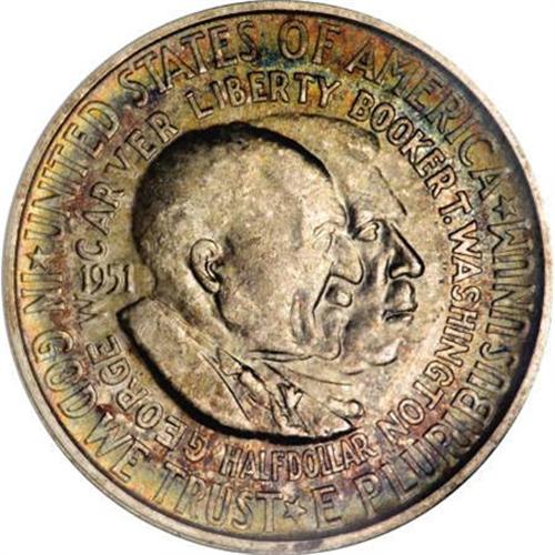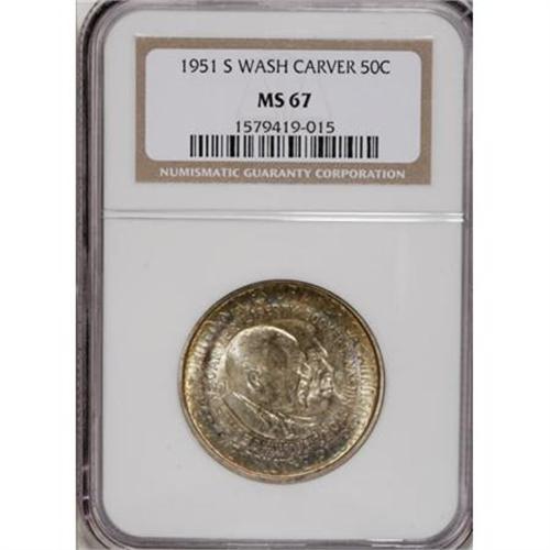 <B>1951-S 50C Washington-Carver MS67 NGC.</B></I> A melange of olive-green, golden-orange, lavender, and aqua-marine toning bathes both sides of this radiantly lustrous Superb Gem, and a powerful strike results in sharp delineation on the design elements. Well preserved, with just a few light marks visible on Arkansas, Oklahoma, and Colorado.<BR><BR><b>Shipping:</b> Coins & Currency (<a target="_blank" href="http://www.heritageauctions.com/common/shipping.php">view shipping information</a>)