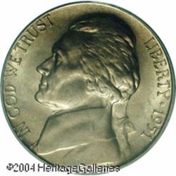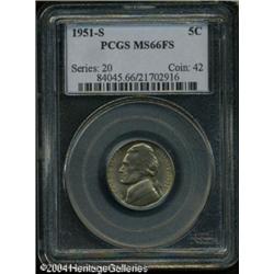 1951-S 5C MS66 Full Steps PCGS. Unusually well def <B>1951-S 5C MS66 Full Steps PCGS.</B></I> Unusually well defined with sharp step detail and a virtual absence of marks or other distractions. Each side is gently coated with a thin layer of golden-silver patina. An original, no-questions Gem example. Population: 16 in 66 Full Steps, 0 finer (10/04). <BR><BR><B>Important notice:</B> Heritage usually auctions material at the rate of 200-250 lots per hour. On some occasions eBay Live bid software or the Internet may not be able to keep up with the pace of the auction. We recommend placing a realistic absentee bid now as insurance to avoid disappointment. Occasionally the auctioneer may eliminate or reject an eBay Live bid, and the auctioneer may also reopen a lot after the close of the eBay live bidding (usually because we missed an audience bid), and may reject your bid even if it shows you as the winning bidder. By bidding via eBay Live, you agree that Heritage may award the lot to another bidder at its sole discretion under the circumstances described above or any other reasonable circumstances. Since eBay bids are not shown to us until we open the lot on the floor, we treat those bids just like floor bids. In most cases the floor responds before the eBay bid is presented to us, due to Internet lag time, so for consistency we have made it a policy that floor bids are always considered first over tie eBay live bids. Also please note that all Heritage lots purchased through eBay Live carry a 20% Buyer's Premium. Please make sure you read the Terms and Conditions before you bid. This lot is being auctioned in conjunction with a live floor auction by Heritage Galleries & Auctioneers. All final auction and invoice information will be supplied by Heritage Galleries & Auctioneers, and all other information should be considered preliminary. Lot:5638