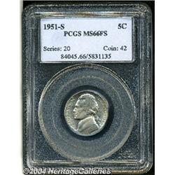 <B>1951-S<5C> MS66 Full Steps PCGS.</B></I> A well struck and satiny premium Gem with faint tan and ivory color. Both sides have wispy vertical striations in the fields, as made. The steps are very sharp for an S-mint issue from the early 1950s. Population: 15 in 66, 0 finer (9/04).<BR><I>From The Gene Holland Collection of United States Coins, Part One.</B></I> <BR><BR><B>Important notice:</B> Heritage usually auctions material at the rate of 200-250 lots per hour. On some occasions eBay Live bid software or the Internet may not be able to keep up with the pace of the auction. We recommend placing a realistic absentee bid now as insurance to avoid disappointment. Occasionally the auctioneer may eliminate or reject an eBay Live bid, and the auctioneer may also reopen a lot after the close of the eBay live bidding (usually because we missed an audience bid), and may reject your bid even if it shows you as the winning bidder. By bidding via eBay Live, you agree that Heritage may award the lot to another bidder at its sole discretion under the circumstances described above or any other reasonable circumstances. Since eBay bids are not shown to us until we open the lot on the floor, we treat those bids just like floor bids. In most cases the floor responds before the eBay bid is presented to us, due to Internet lag time, so for consistency we have made it a policy that floor bids are always considered first over tie eBay live bids. Also please note that all Heritage lots purchased through eBay Live carry a 20% Buyer's Premium. Please make sure you read the Terms and Conditions before you bid.