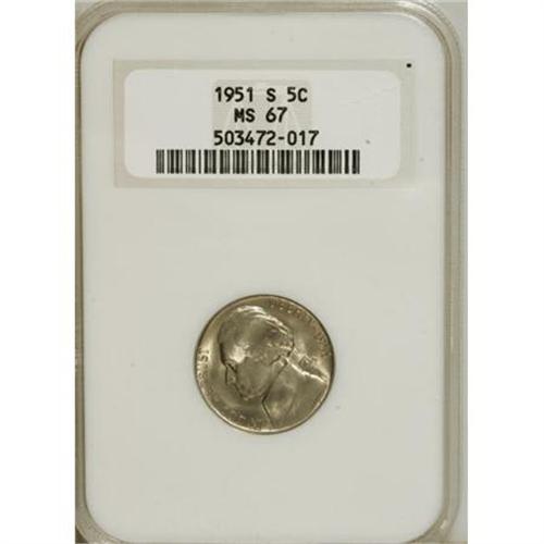 <B>1951-S 5C MS67 NGC.</B></I> NGC Census: (49/0). PCGS Population (0/0). Mintage: 7,776,000. (#4045)<BR><BR><B>Coin Engraver:</B> Felix Schlag<BR><BR><b>Shipping:</b> Coins & Currency (<a target="_blank" href="http://www.heritageauctions.com/common/shipping.php">view shipping information</a>)