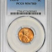A spendid gem with every turn, the frosty orange-red surface of theis beautiful cent seemingly glows from within with rich luster. The eye appeal is top-notch and the overall quality stakes a claim to perfection. Tiesd for finest certified at PCGS PCGS Population: 160, nione finer within any color designation. 16 of the 160 are designated "+" by Pcgs. PCGS #2794