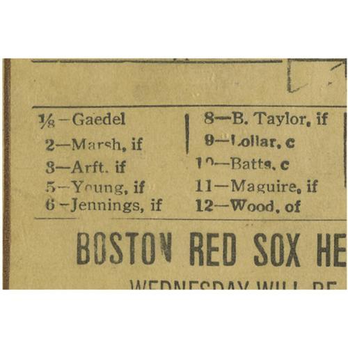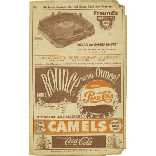 <B>1951 St. Louis Browns "Eddie Gaedel Game" Scorecard.</B></I> In Hall of Fame executive Bill Veeck's most famous stunt, he trotted out a three-foot seven-inch pinch hitter named Eddie Gaedel in the second game of an August 19, 1951 Browns doubleheader against the Tigers. After recovering from a bout a laughter at the absurdity of the situation, Detroit pitcher Bob Cain failed in four attempts to touch Gaedel's microscopic strike zone, and Gaedel took his base before being immediately removed for a pinch runner, ending his baseball career. Gaedel would later say that he had been warned by Veeck that a sniper was stationed in the stands with instructions to fire if the bat left his shoulder. Here we present one of the few surviving examples of that day's official scorecard, listing "Gaedel" as a roster player with the jersey number he wore to the left: "1/8." Despite obvious condition problems, most notably vertical center creasing and chipping at the corners, the tremendous appeal of this rarity cannot be denied. Perhaps no baseball artifact on earth could better remind us that baseball is first and foremost a game, and that it's supposed to be fun. And if this humble scorecard doesn't coax a smile, we just feel sorry for you.<BR><BR><b>Shipping:</b> Flat Material, Small (<a target="_blank" href="http://www.heritageauctions.com/common/shipping.php">view shipping information</a>)
