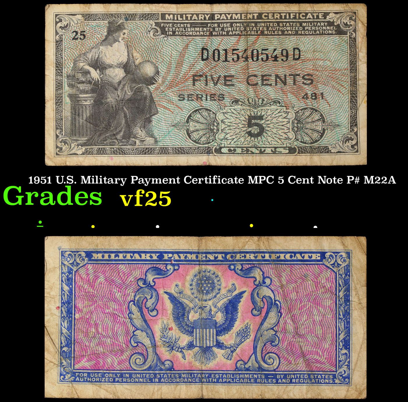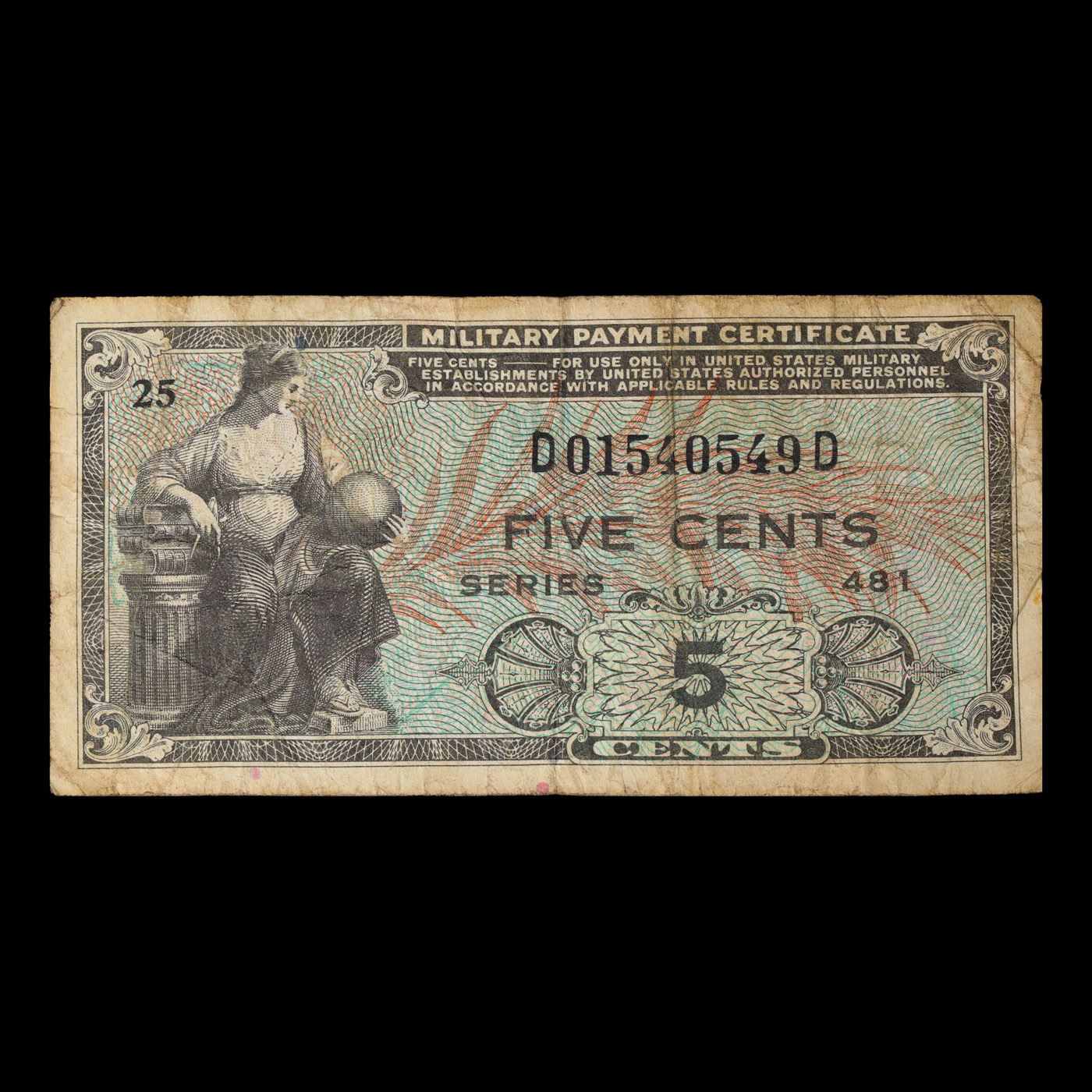 1951 U.S. Military Payment Certificate MPC 5 Cent Note P# M22A Grades vf+. Allied Military Currency ("AMC") was a form of currency issued by the Allied powers during World War II, to be issued to troops entering liberated or newly occupied countries. Historically, soldiers serving overseas had been paid in local currency rather than in their "home" currency. Most cash drawn by soldiers would go directly into the local economy, and in a damaged economy the effects of a hard currency such as the dollar circulating freely alongside weaker local currencies could be severely problematic, risking severe inflation.