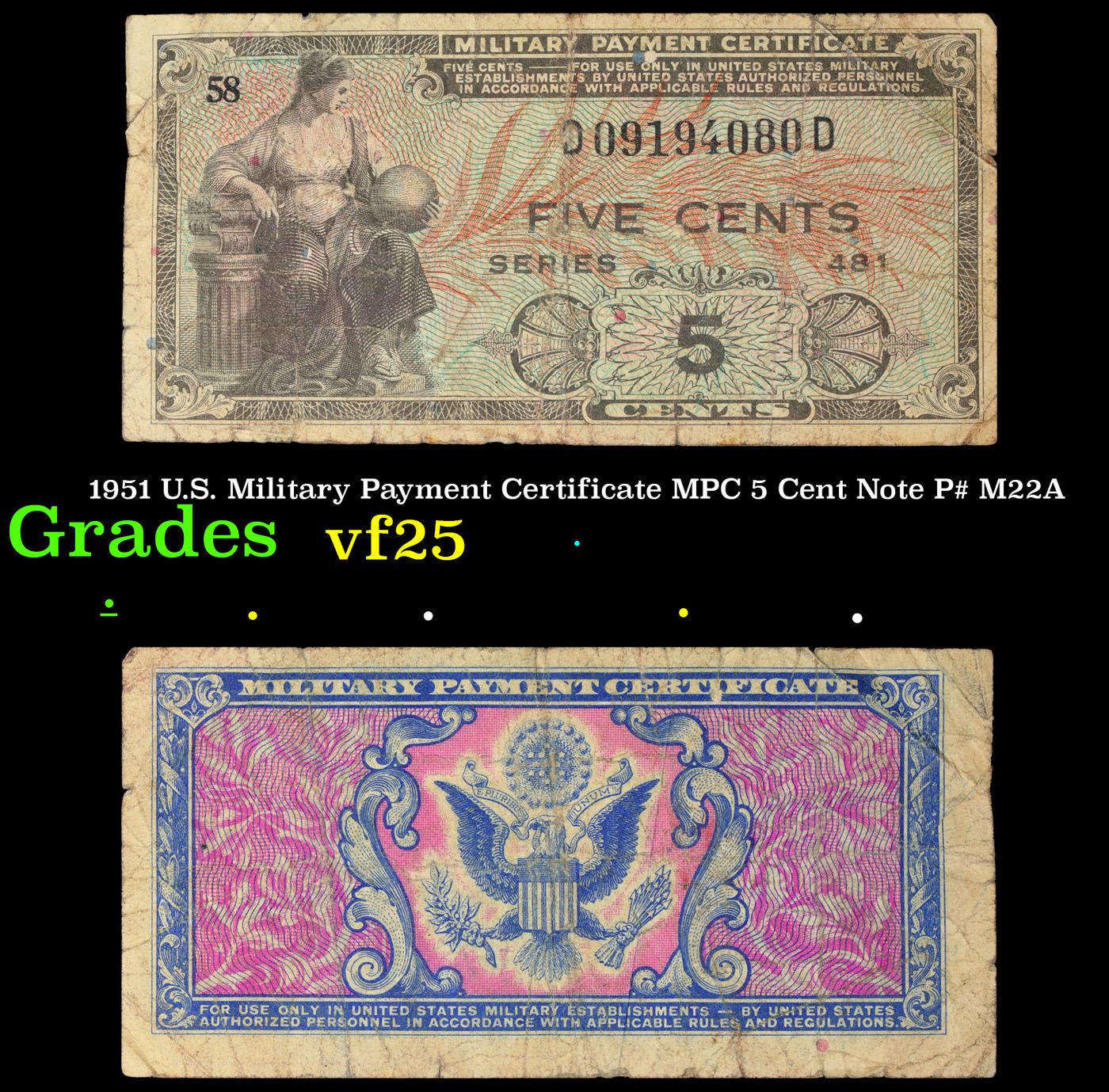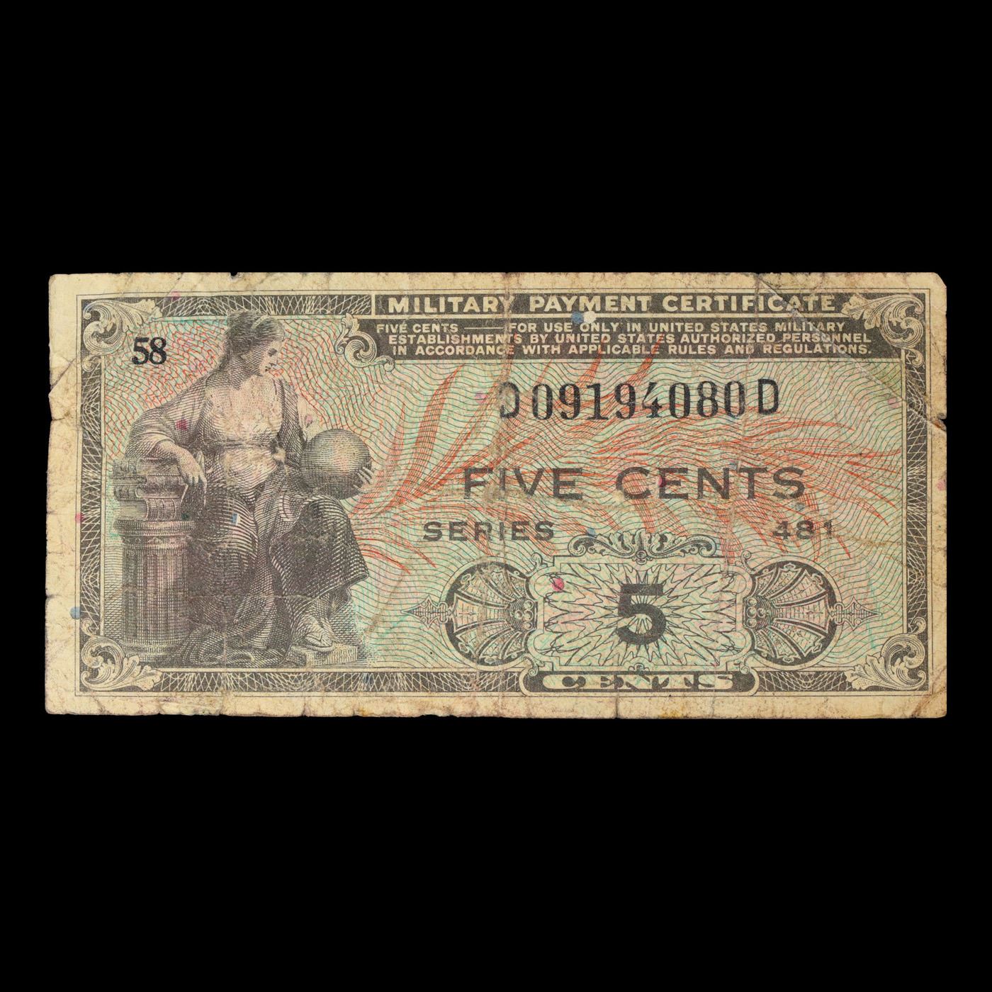 1951 U.S. Military Payment Certificate MPC 5 Cent Note P# M22A Grades vf+. Allied Military Currency ("AMC") was a form of currency issued by the Allied powers during World War II, to be issued to troops entering liberated or newly occupied countries. Historically, soldiers serving overseas had been paid in local currency rather than in their "home" currency. Most cash drawn by soldiers would go directly into the local economy, and in a damaged economy the effects of a hard currency such as the dollar circulating freely alongside weaker local currencies could be severely problematic, risking severe inflation.