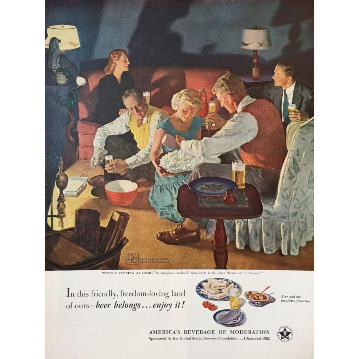 Original 1951 Norman Rockwell-style magazine advertisement for the United States Brewer's Foundation, to promote drinking beer at home with friends. Number 51 in the series "Home Life in America." "Winter Evening At Home" by Douglas Crockwell. 10" X 14". Mounted on archival linen canvas for preservation.