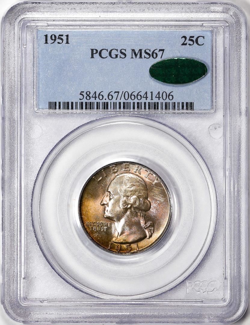 One 1951 Washington Quarter Coin PCGS MS67 CAC Great Toning. PCGS Graded.