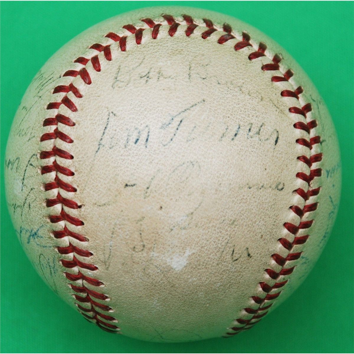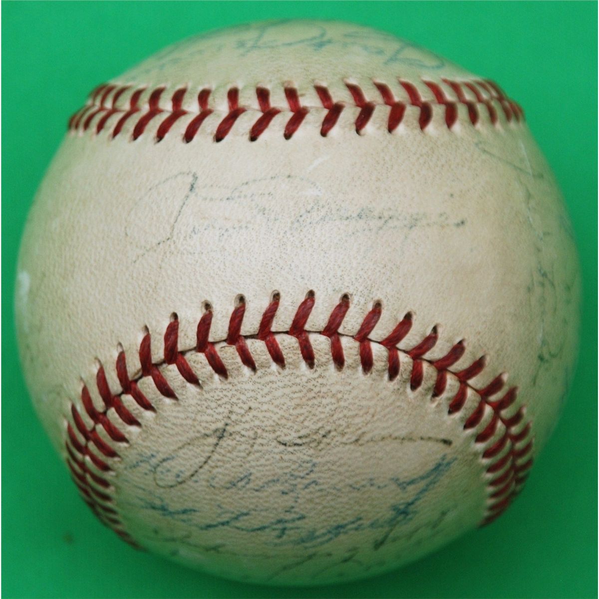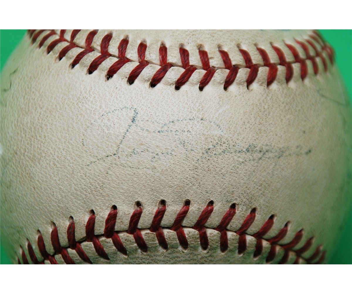 1951 New York Yankees Team Signed Baseball. Widely considered to be the most desirable of all post-war team balls are those featuring the 1951 Bronx Bombers, who earned the third of five consecutive World Championships under the new reign of Hall of Fame manager Casey Stengel. rare ball to have both DiMaggio and Mantle, since this is the only Season that saw Joe DiMaggio and Mickey Mantle share an outfield. Each is present and accounted for on this Official American League ball along with twenty four other Yanks, Berra, Rizzuto, Mize, Collins,Turner,Jensen, Overmire and more. Signature quality is on the light side both DiMaggio's and mantles signatures are around 2/10-3/10 in darkness with the rest of the signatures in the range of 2/10 to 5/10. Although there has been fading to the signatures, it is a rare example of this, one of the greatest teams in baseball history. LOA from James Spence Authentication