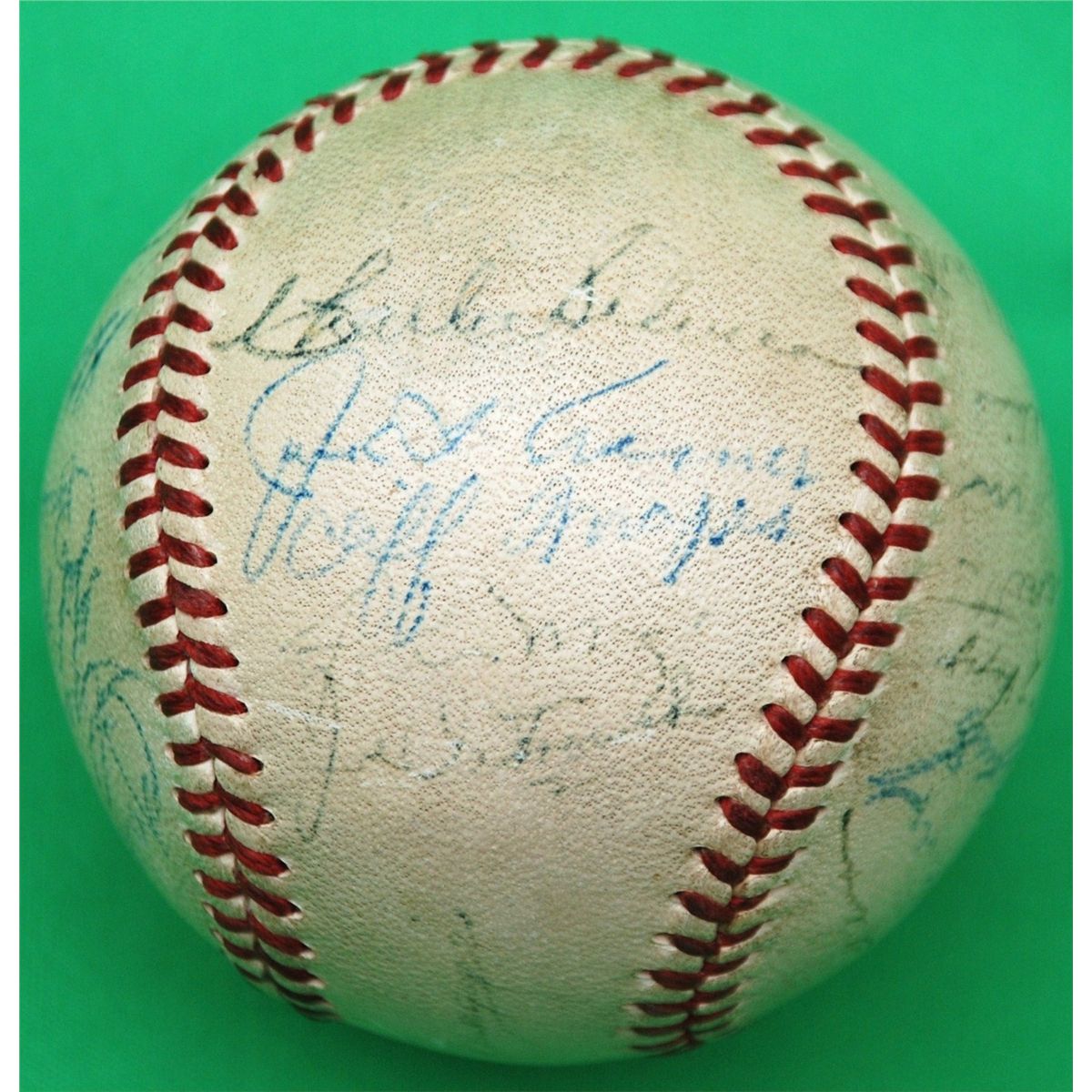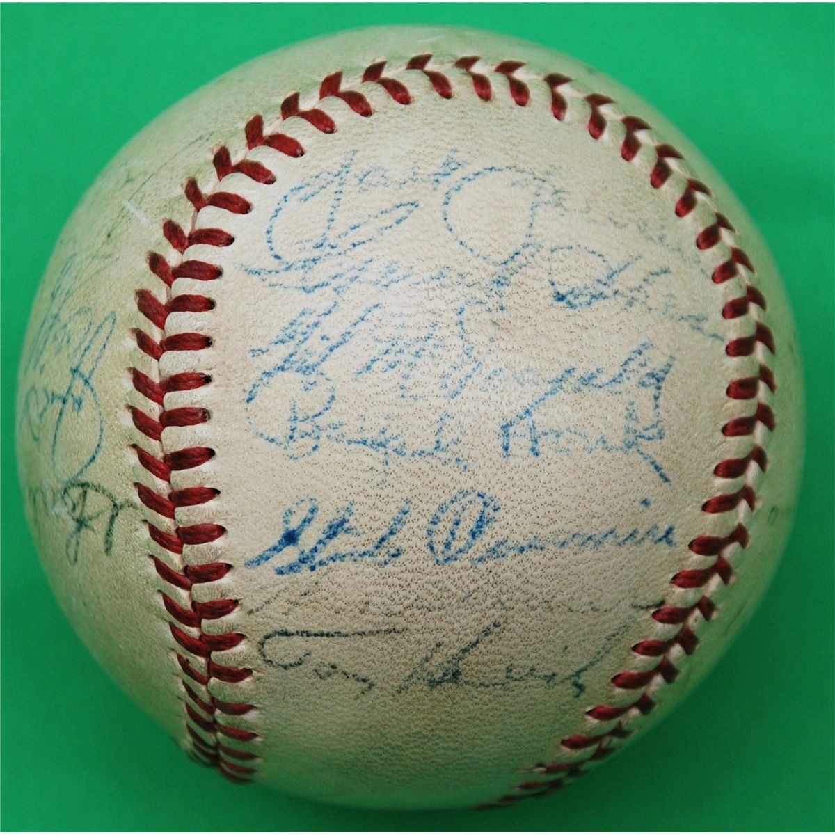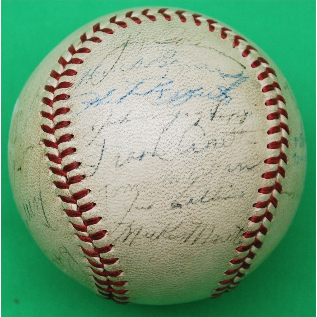 1951 New York Yankees Team Signed Baseball. Widely considered to be the most desirable of all post-war team balls are those featuring the 1951 Bronx Bombers, who earned the third of five consecutive World Championships under the new reign of Hall of Fame manager Casey Stengel. rare ball to have both DiMaggio and Mantle, since this is the only Season that saw Joe DiMaggio and Mickey Mantle share an outfield. Each is present and accounted for on this Official American League ball along with twenty four other Yanks, Berra, Rizzuto, Mize, Collins,Turner,Jensen, Overmire and more. Signature quality is on the light side both DiMaggio's and mantles signatures are around 2/10-3/10 in darkness with the rest of the signatures in the range of 2/10 to 5/10. Although there has been fading to the signatures, it is a rare example of this, one of the greatest teams in baseball history. LOA from James Spence Authentication