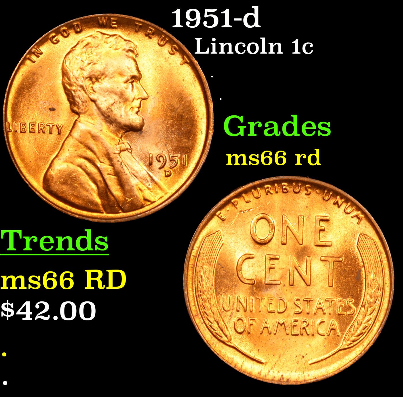 1951-d Lincoln Cent 1c Grades GEM+ Unc RD.