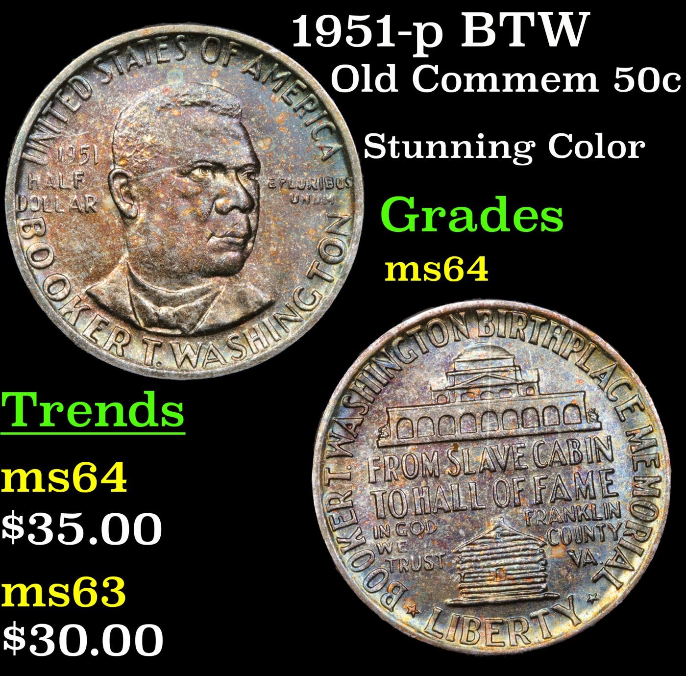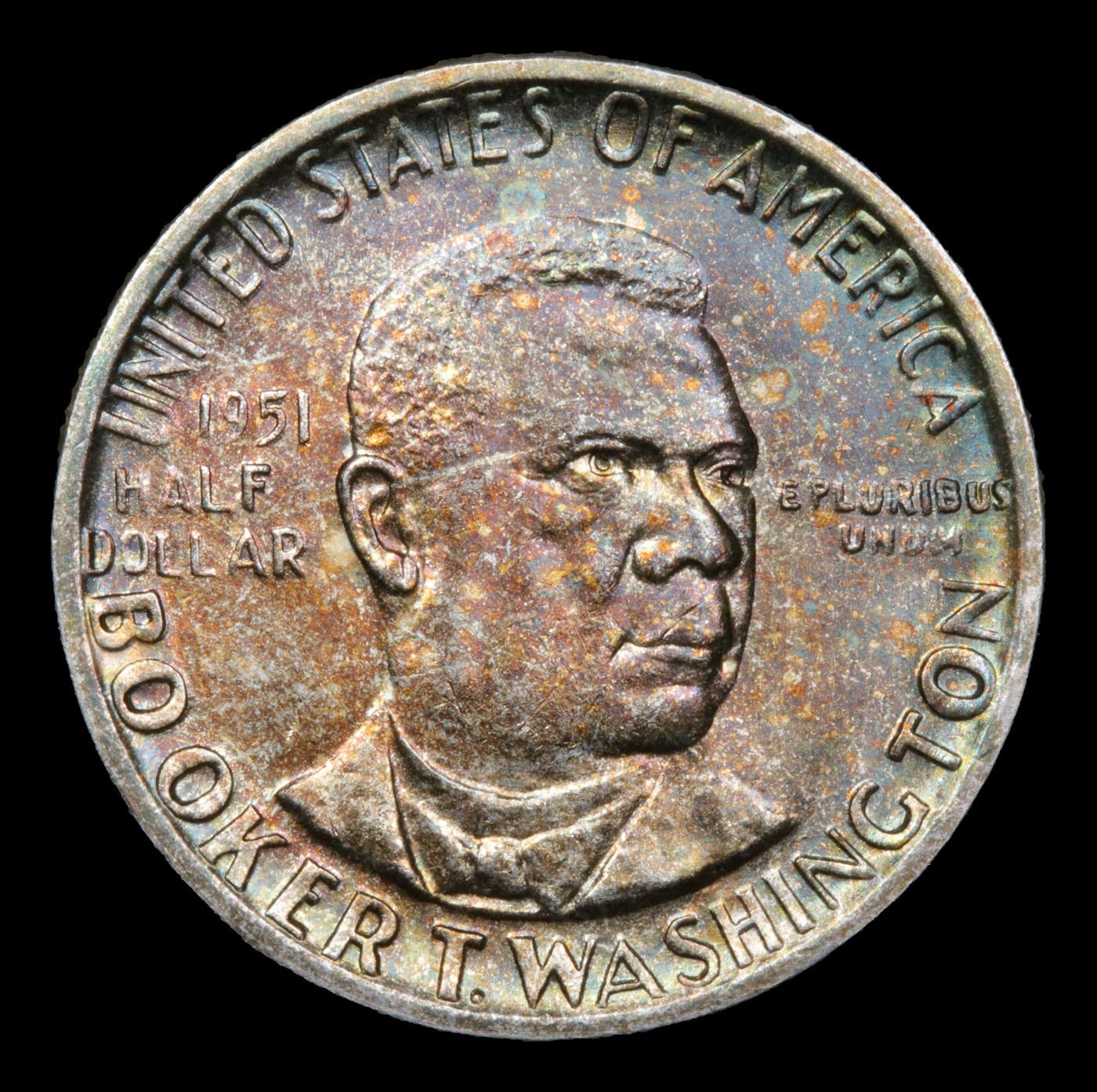 1951-p BTW Old Commem Half Dollar 50c Grades Choice Unc. When examining a Booker T. Washington commemorative look for wear on the high points, on the obverse that is Mr. Washington's right Cheek (from his perspective), and on the reverse the arches on the top building.