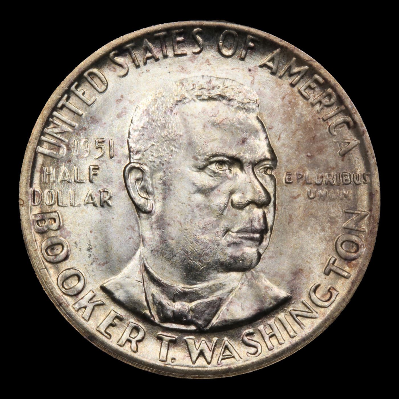 1951-p BTW Old Commem Half Dollar 50c Grades Choice+ Unc. When examining a Booker T. Washington commemorative look for wear on the high points, on the obverse that is Mr. Washington's right Cheek (from his perspective), and on the reverse the arches on the top building.