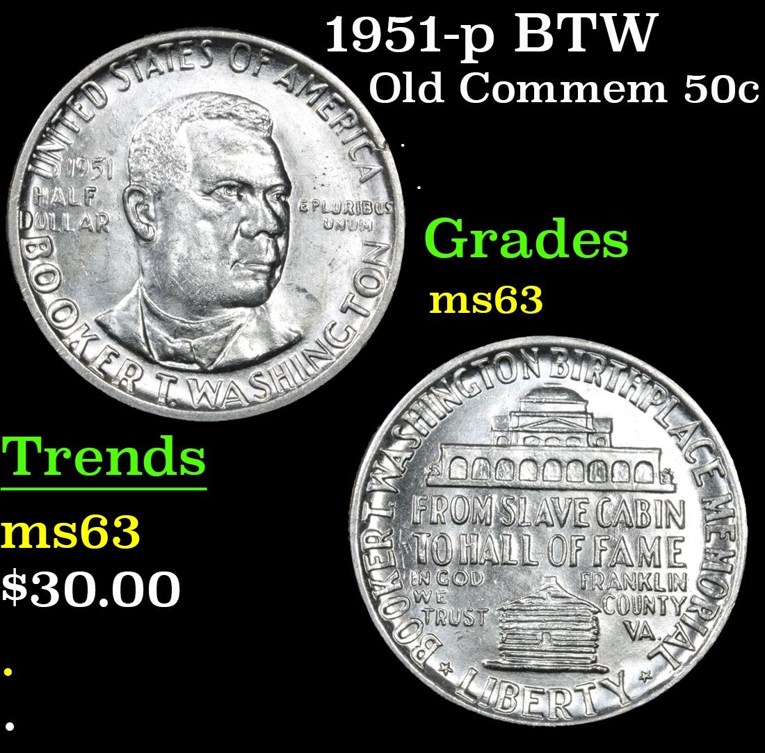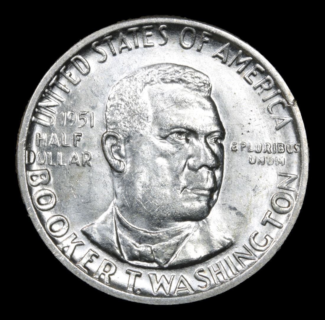 1951-p BTW Old Commem Half Dollar 50c Grades Select Unc. When examining a Booker T. Washington commemorative look for wear on the high points, on the obverse that is Mr. Washington's right Cheek (from his perspective), and on the reverse the arches on the top building.