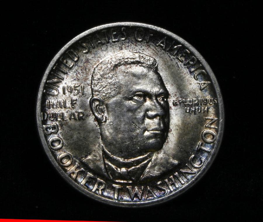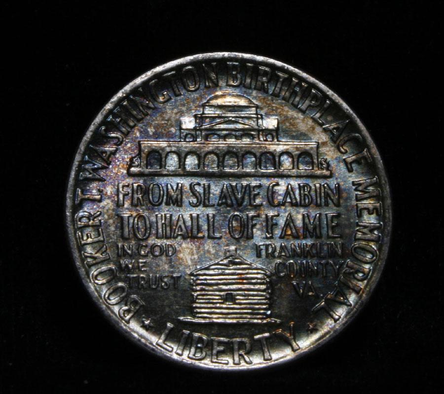 Much scarcer date, this the final year of the BTW commemorative. This year is valued at almost 3x the inaugural year of the coin. Terrific all natural toning highlight this beautiful example. Superior eye appeal. When examining a Booker T. Washington commemorative look for wear on the high points, on the obverse that is Mr. Washington's right Cheek (from his perspective), and on the reverse the arches on the top building. The Wholesale Greysheet lists ms63 at $50. Estimated Value $60