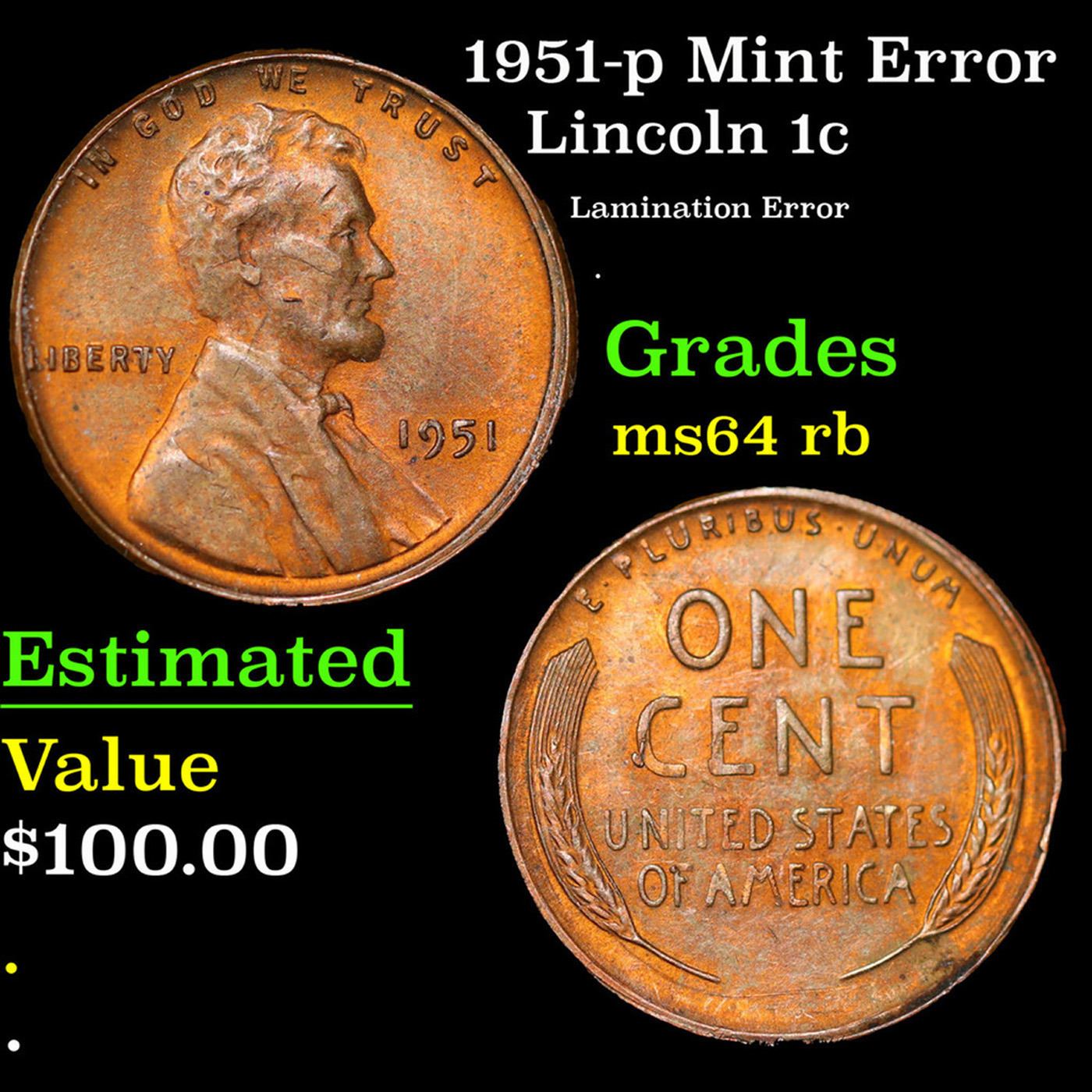 1951-p Mint Error Lincoln Cent 1c Grades Choice Unc RB.
