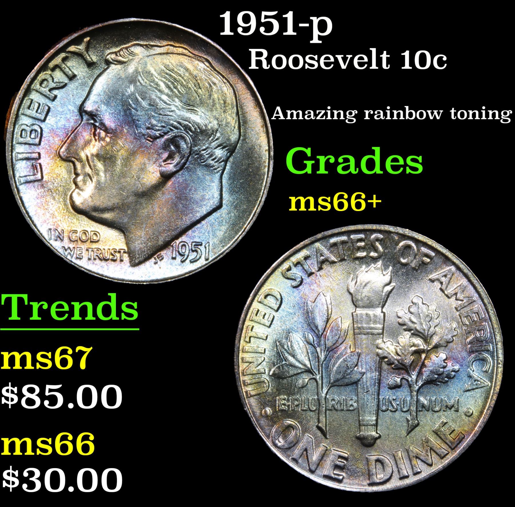 1951-p Roosevelt Dime 10c Grades GEM++ Unc. Amazing rainbow toning A Corey's Pick, Bid to Win, Don't let it get Away, you might not find its equal Coin. I give this coin my highest recommendation