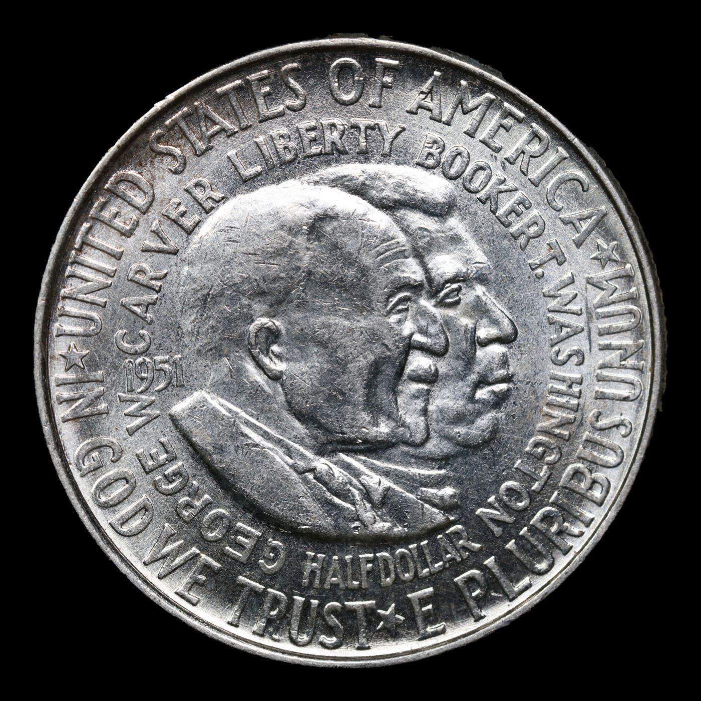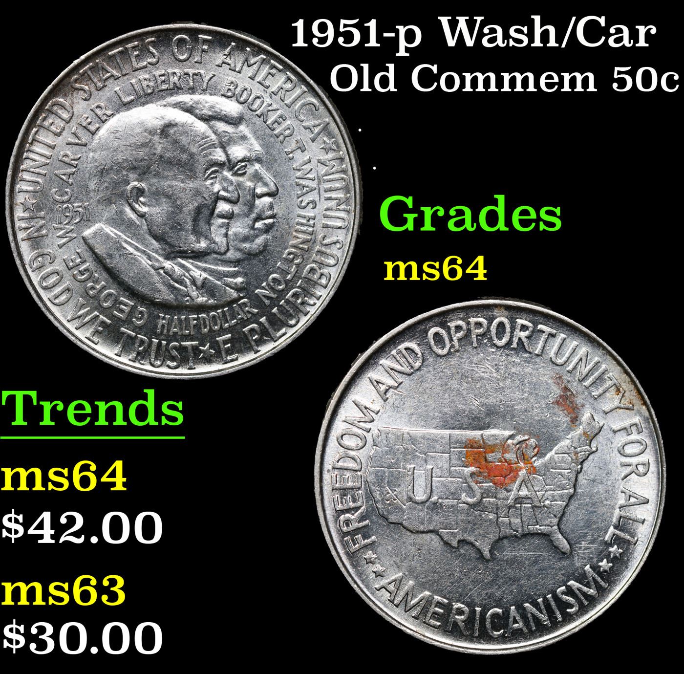 1951-p Wash/Car Old Commem Half Dollar 50c Grades Choice Unc. The Final Coin in the Old Commemorative Program. It was Minted to Revive the Ending Booker T Washington Commemorative and to Honor Washington Carver. When examining a Wash/Carver examine the High Points, which are Carver's cheek on the Obverse and the Center of the USA on the Reverse.