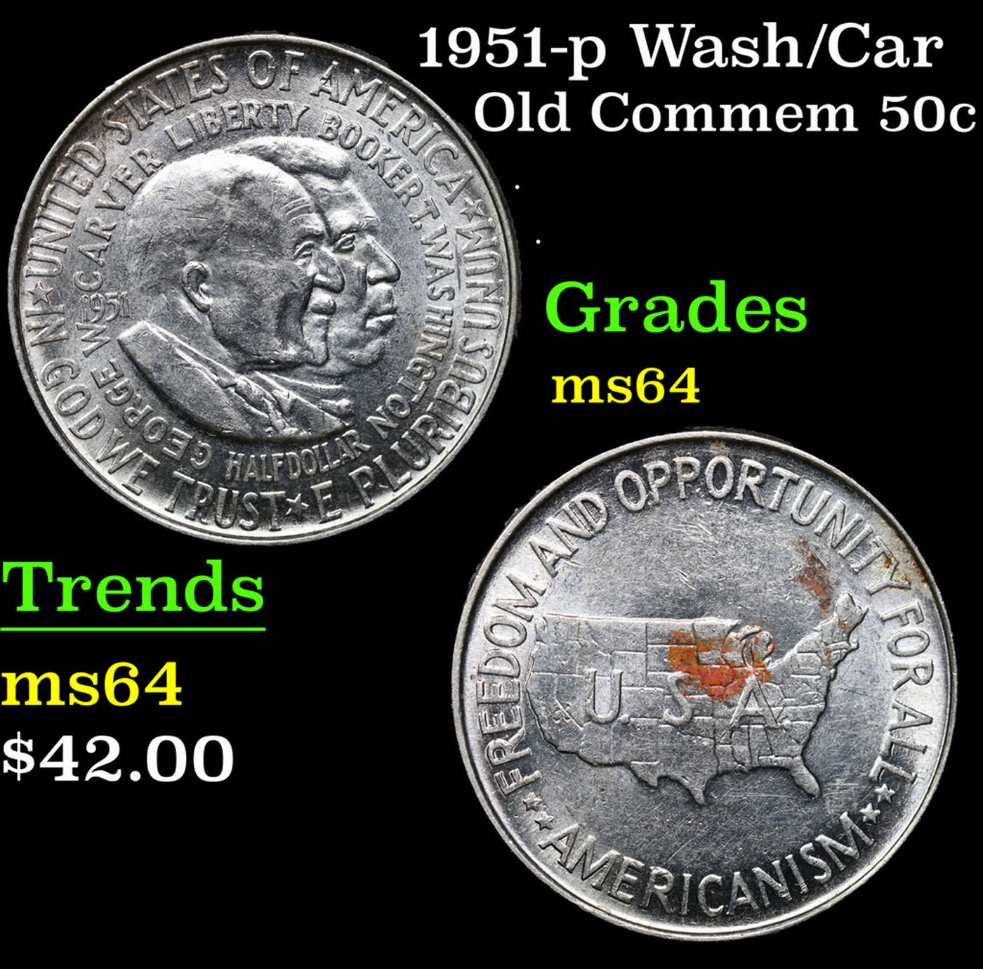 1951-p Wash/Car Old Commem Half Dollar 50c Grades Choice Unc. The Final Coin in the Old Commemorative Program. It was Minted to Revive the Ending Booker T Washington Commemorative and to Honor Washington Carver. When examining a Wash/Carver examine the High Points, which are Carver's cheek on the Obverse and the Center of the USA on the Reverse.