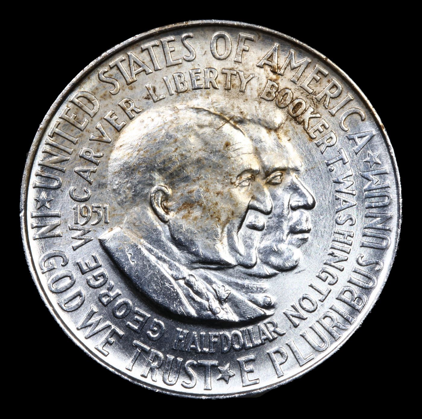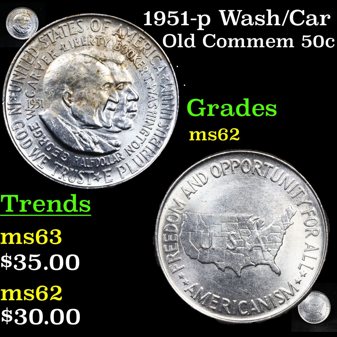 1951-p Wash/Car Old Commem Half Dollar 50c Grades Select Unc. The Final Coin in the Old Commemorative Program. It was Minted to Revive the Ending Booker T Washington Commemorative and to Honor Washington Carver. When examining a Wash/Carver examine the High Points, which are Carver's cheek on the Obverse and the Center of the USA on the Reverse.