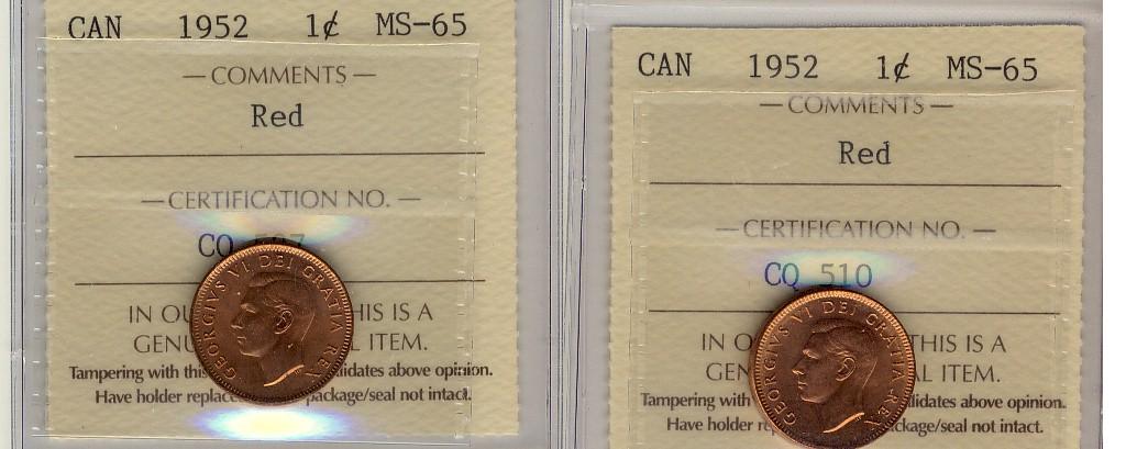 1952 1¢ ICCS MS65RD. Lot of 2 coins all red.
