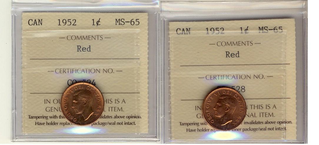 1952 1¢ ICCS MS65RD. Lot of 2 coins all red.