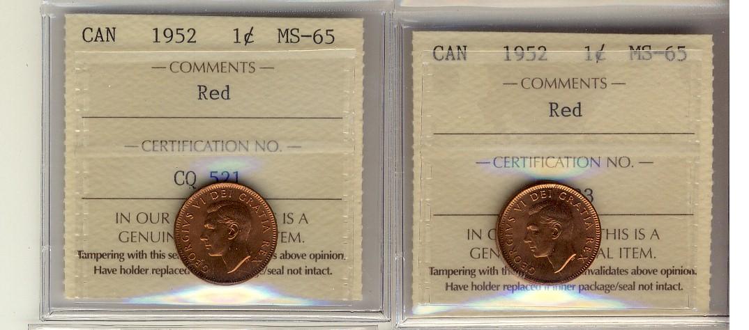 1952 1¢ ICCS MS65RD. Lot of 2 coins all red.