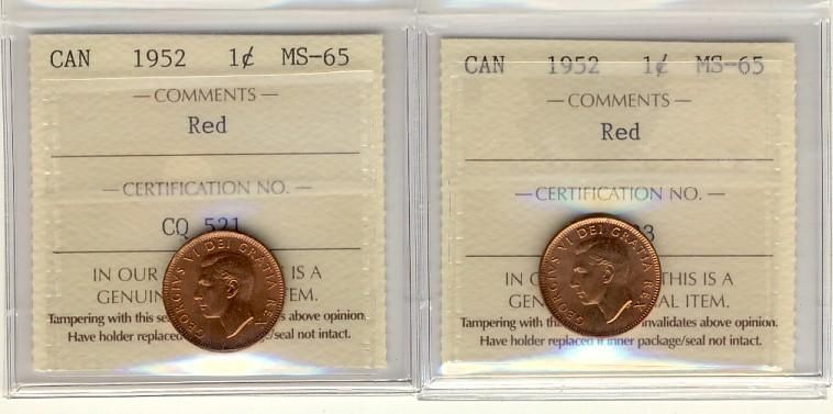 1952 1¢ ICCS MS65RD. Lot of 2 coins all red.