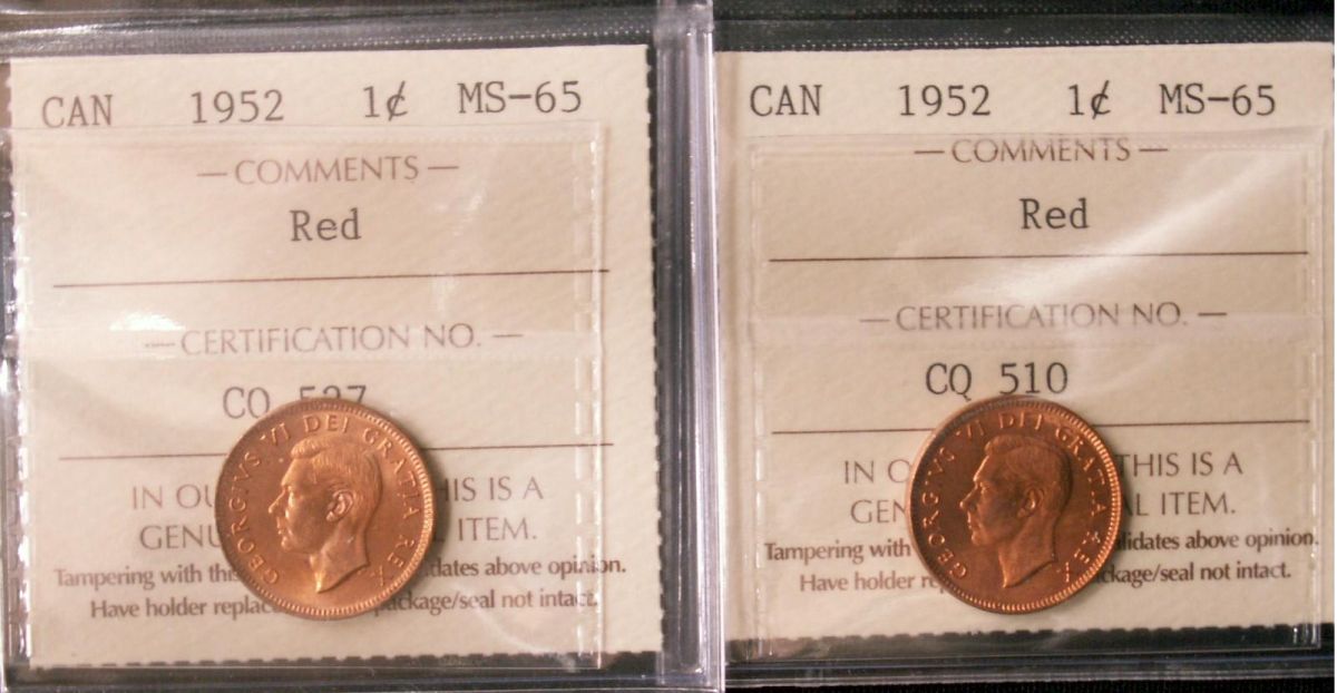 1952 1¢ ICCS MS65RD. Lot of 2 coins all red.