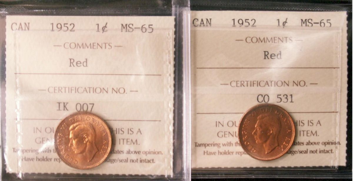 1952 1¢ ICCS MS65RD. Lot of 2 coins all red.