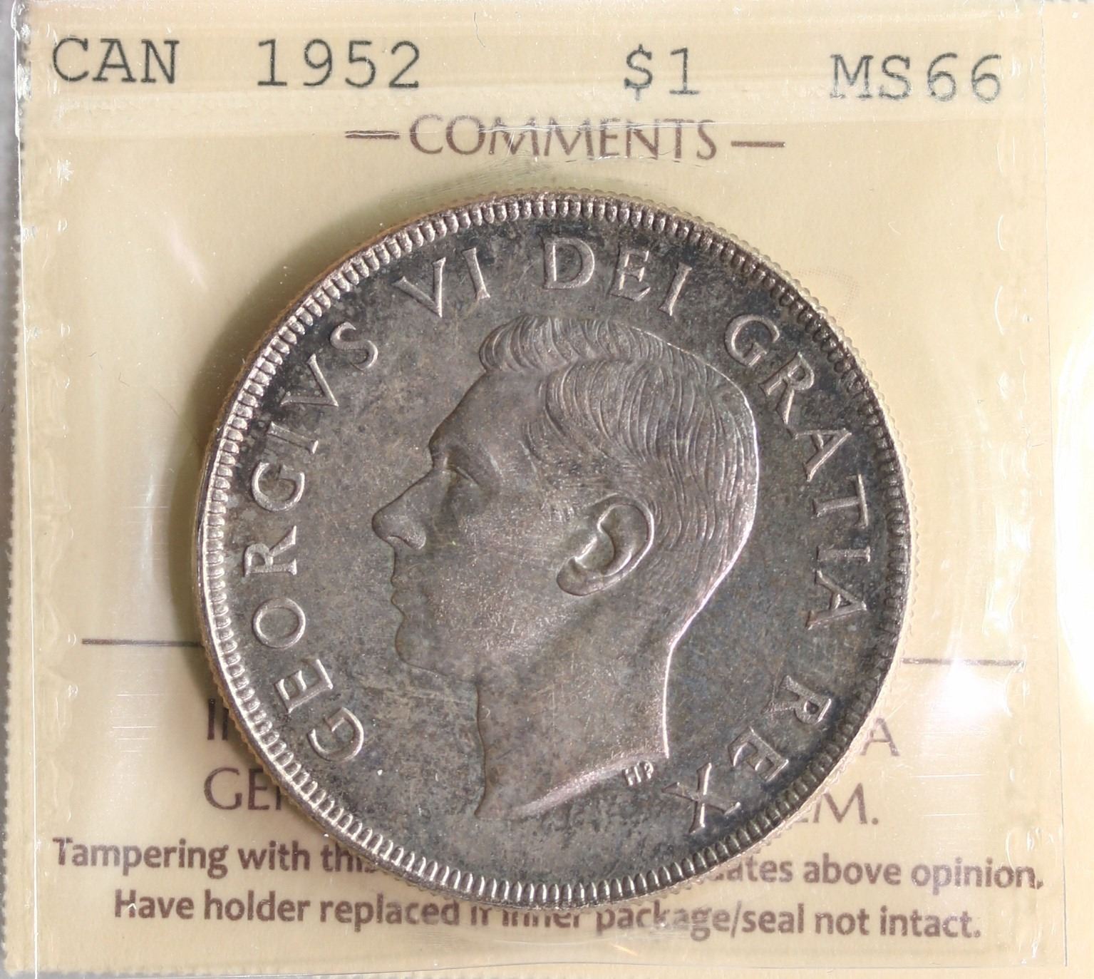 1952 $1 "NWL" ICCS Superb Gem Mint State-66, Attractive toning over full underlying lustre. Great fields and surfaces. Excessively scarce in this top condition! Worth a premium bid.