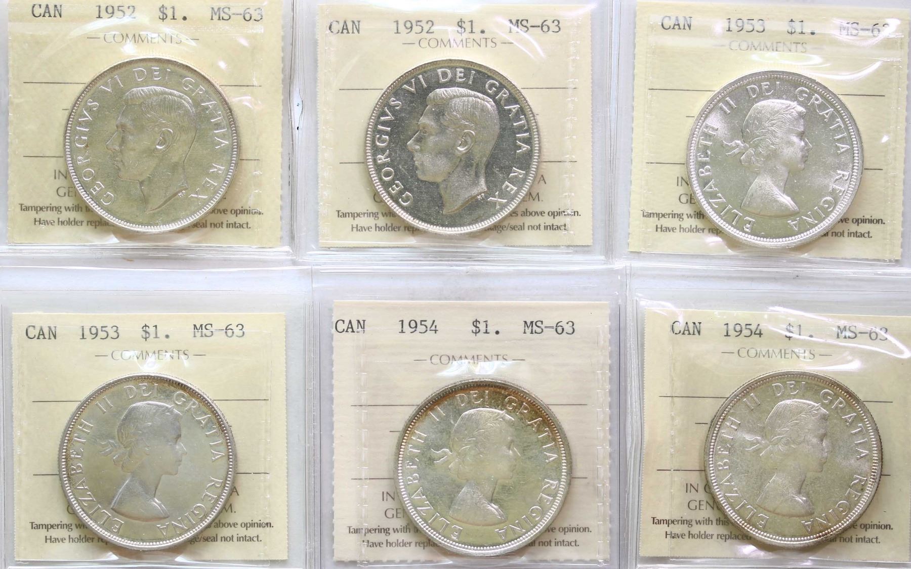 1952 $1 "WL", 1952 "SWL", 1953 "SF", 1953 "NSF", 1954, 1954 "SWL" All 6 coins ICCS Choice Mint State-63.