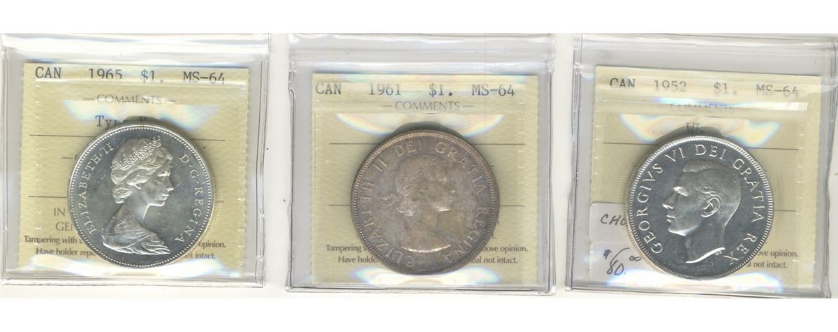 1952 $1 WL, 1961 & 1965 T5 ICCS MS64. Lot of 3 coins.