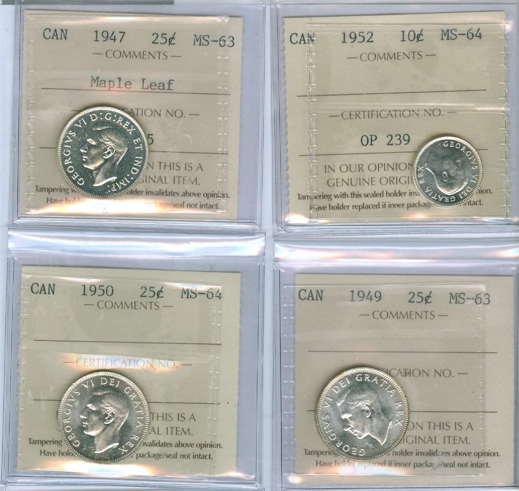 1952 10¢ - 1950 25¢. Lot of four Mintstate coins all ICCS graded. Includes 1952 10¢ MS64, 1947 ML 25¢ MS63, 1949 25¢ MS63 and 1950 25¢ MS64.