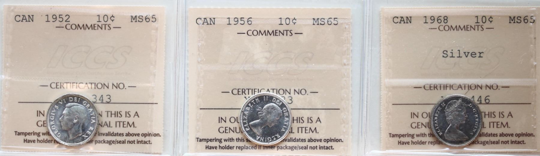 1952 10¢, 1956, 1968 "Silver", All 3 coins ICCS Gem Mint State-65.