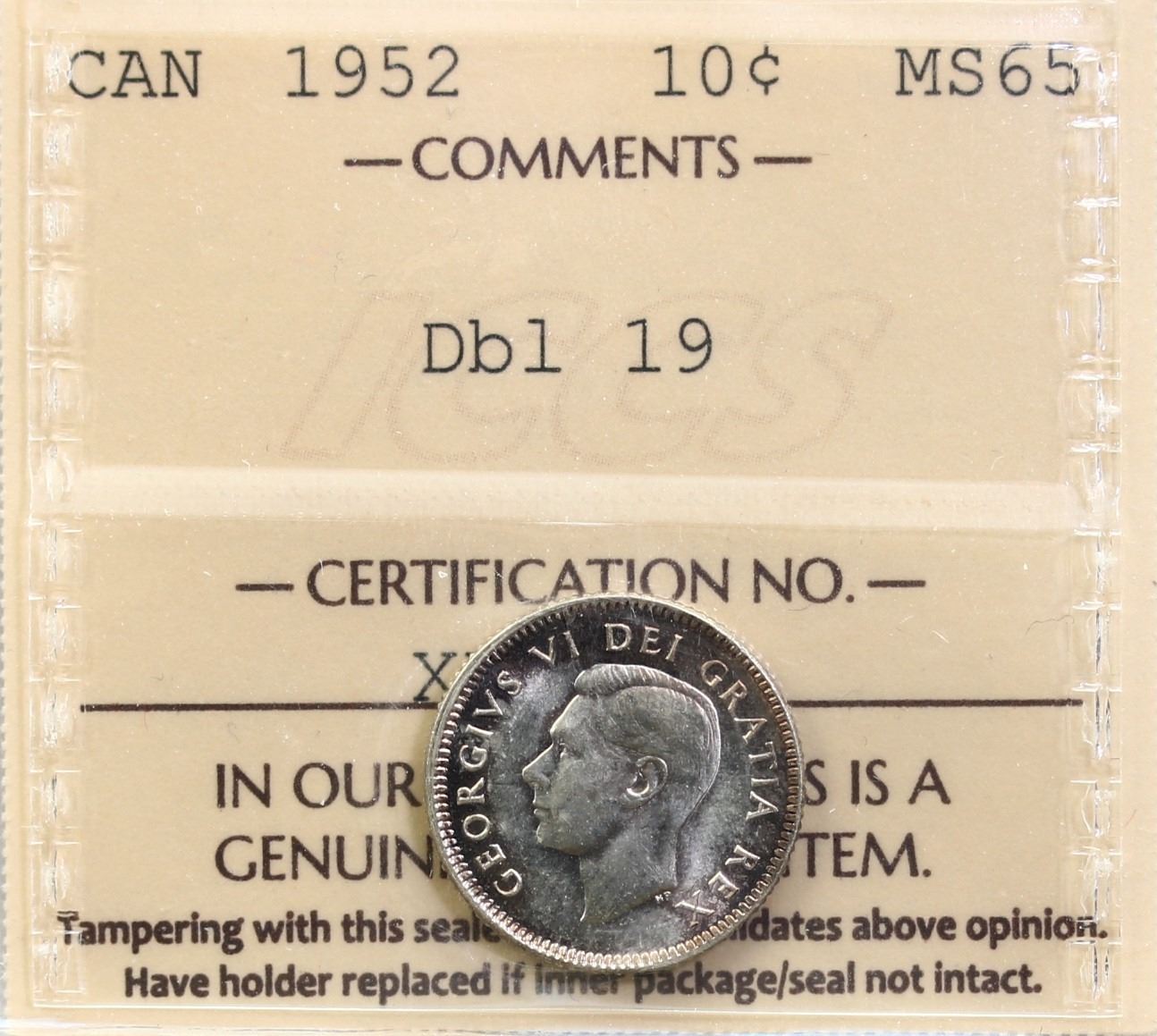 1952 10¢ "Dbl 19" ICCS Gem Mint State-65. Lightly toned with strong luster, another unlisted variety worthy of attention. Rarer than the popular and high-earning 1951 "DBL 19" examples. An impressive offering sure to excite collectors of this series, far more difficult to locate than the popular 1951 dimes with the doubled 19. A 1938 "Dbl 193" in Choice Mint State-64 brought it $896 at the 2025 Summer Sale.