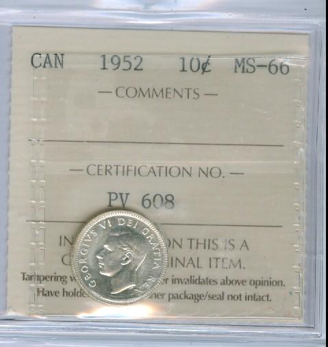 1952 10¢ ICCS MS66. Pristine full white example.