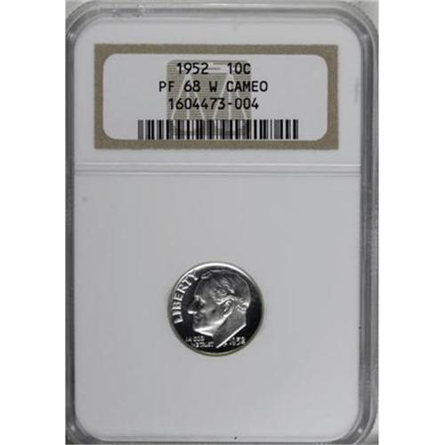 <B>1952 10C PR68 W Cameo NGC.</B></I> NGC Census: (35/0). PCGS Population (5/1). Numismedia Wsl. Price for NGC/PCGS coin in PR68: $1,050. (#85227)<BR><BR><b>Shipping:</b> Coins & Currency (<a target="_blank" href="http://www.heritageauctions.com/common/shipping.php">view shipping information</a>)
