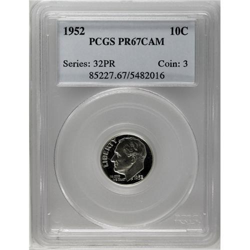<B>1952<10C> PR67 Cameo PCGS.</B></I> A flashy black-and-white cameo with essentially untoned and deeply reflective fields. The details on both sides are struck up sharply.