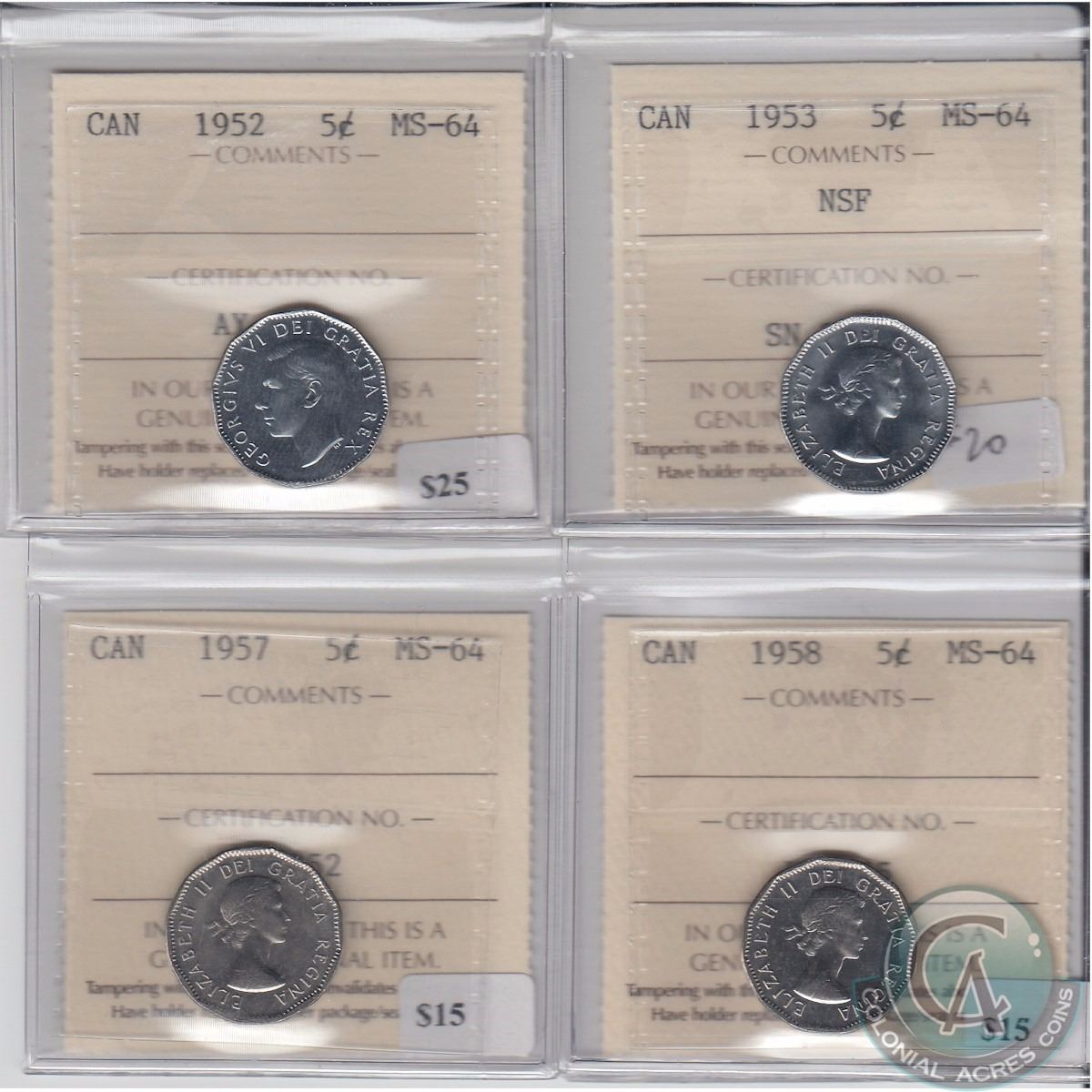 1952, 1953 NSF, 1957 and 1958 Canada 5-cent all ICCS Certified MS-64 (4pcs)