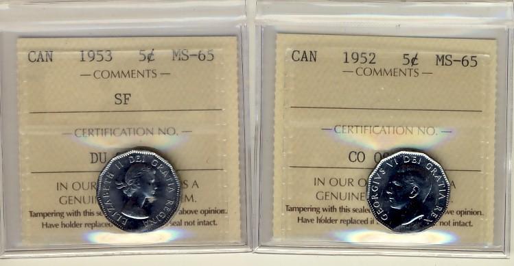 1952 & 1953 SF 5¢ ICCS MS65. Lot of 2 coins.